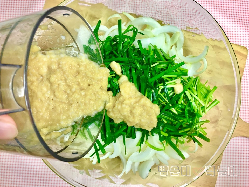 부추를 담고, 찬밥풀 갈아 놓은