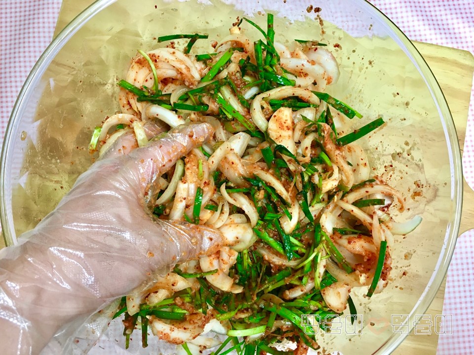 장갑낀 손으로 골고루 버무립니다.