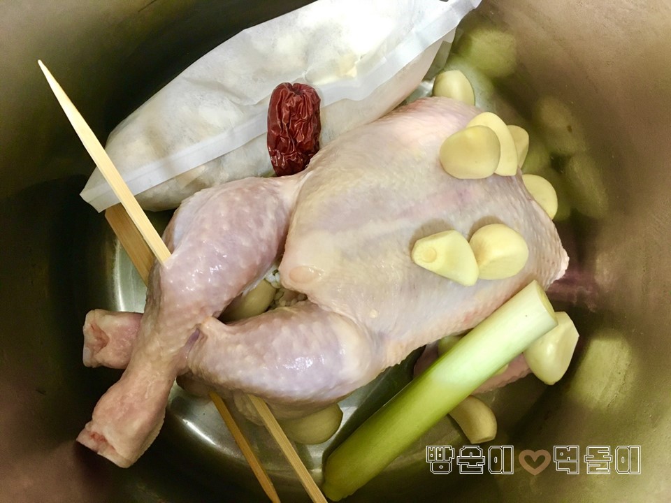생닭을 넣고, 삼계탕용 약재팩 1개,