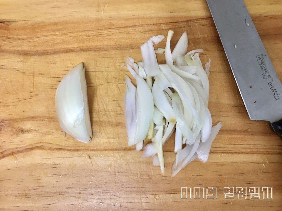 ▲ 양파 1/2개를 반달모양으로 썰어줍니다. 그리고 계란 2개는 미리 풀어서 잘 저어줍니다.