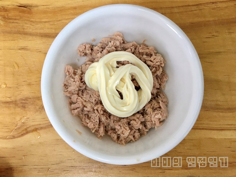 ▲ 기름기를 뺀 참치에 마요네즈 약 2.5큰술을 넣고, 잘 버무려 줍니다.