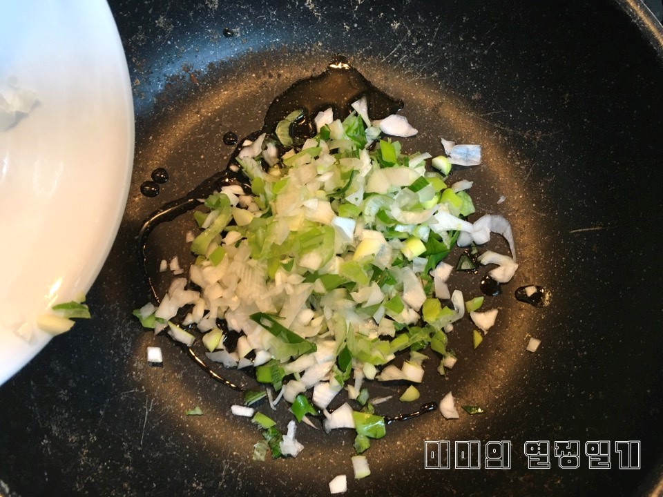 ③ 들기름, 대파, 다진 마늘 넣고 볶기