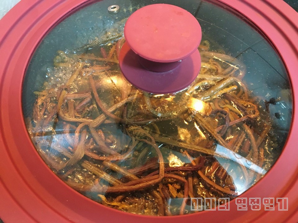 ▲ 뚜껑 닫고 끓입니다. 대략 30분 이상 약불로 끓여주세요. 확실히 부드러워질 때까지 끓여야 합니다.