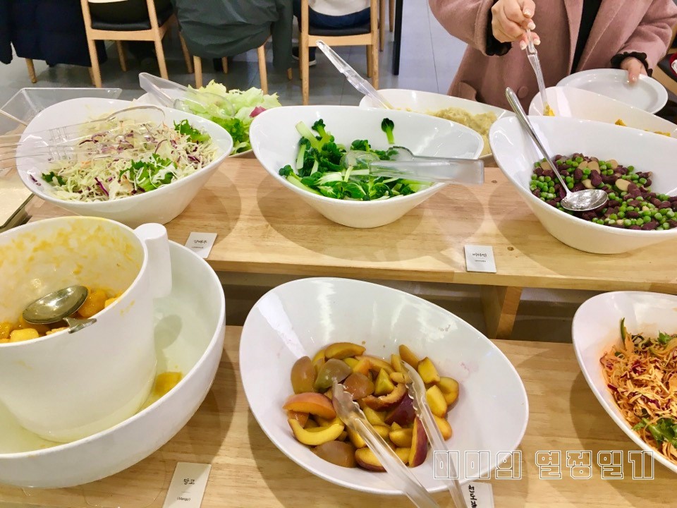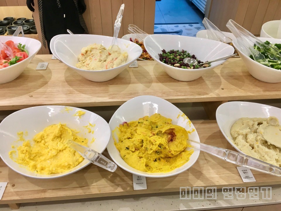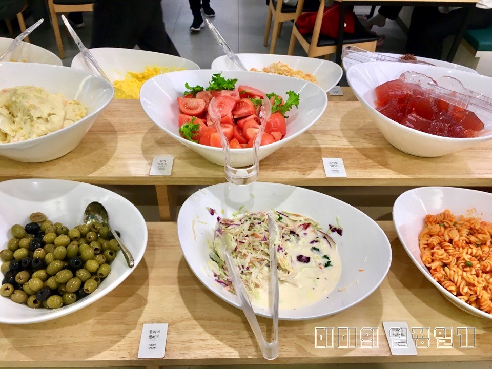 토마토, 콘, 올리브, 양배추, 애그, 감자, 젤리, 단호박 등등 있습니다. 이 중에 애그와 단호박 샐러드 맛있습니다.