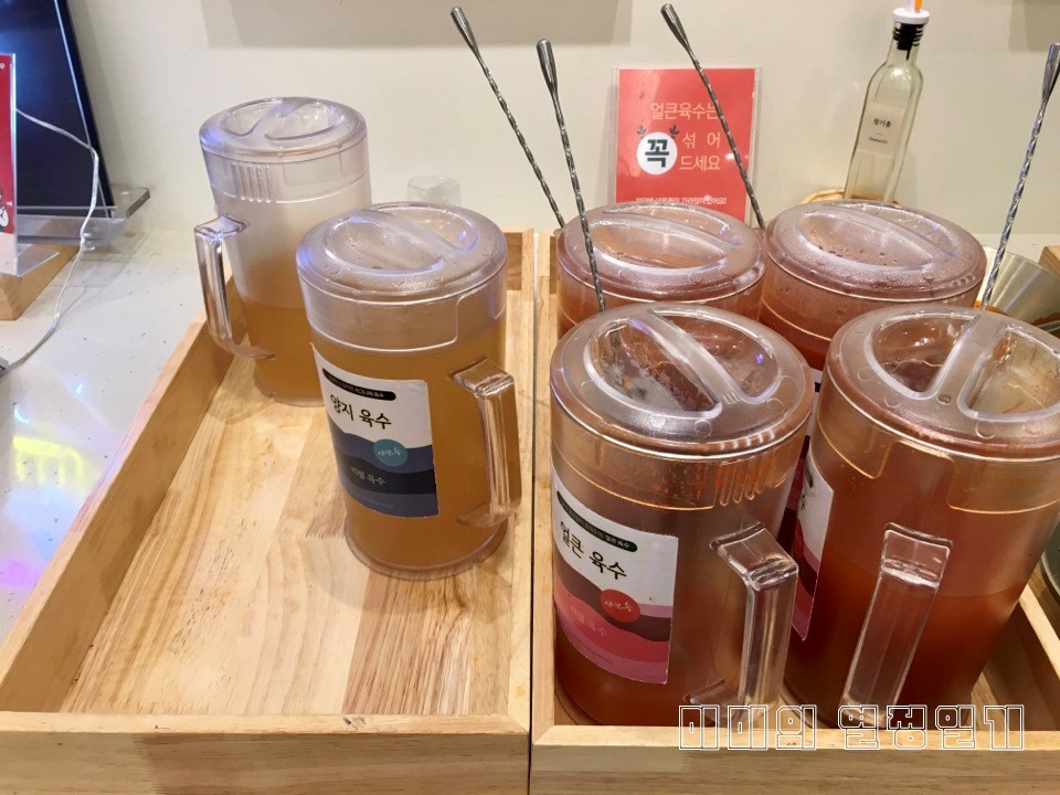 ▲ 양지육수와 얼큰 육수 두 가지는 계속해서 리필해서 먹을 수 있습니다. 여러 번 가져다가 부어 먹으면서 조절하면 좋습니다.