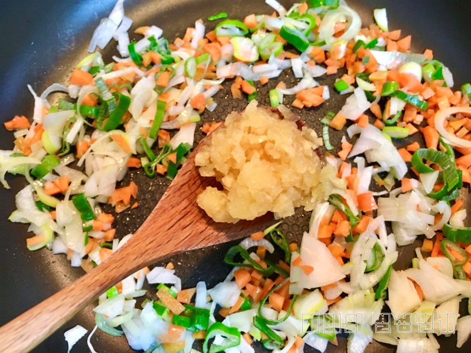 ▲ 그리고, 다진 마늘 1큰술을 같이 넣어서 볶아주세요. 다진 마늘 향이 솔솔 올라오면서 침샘을 자극합니다.