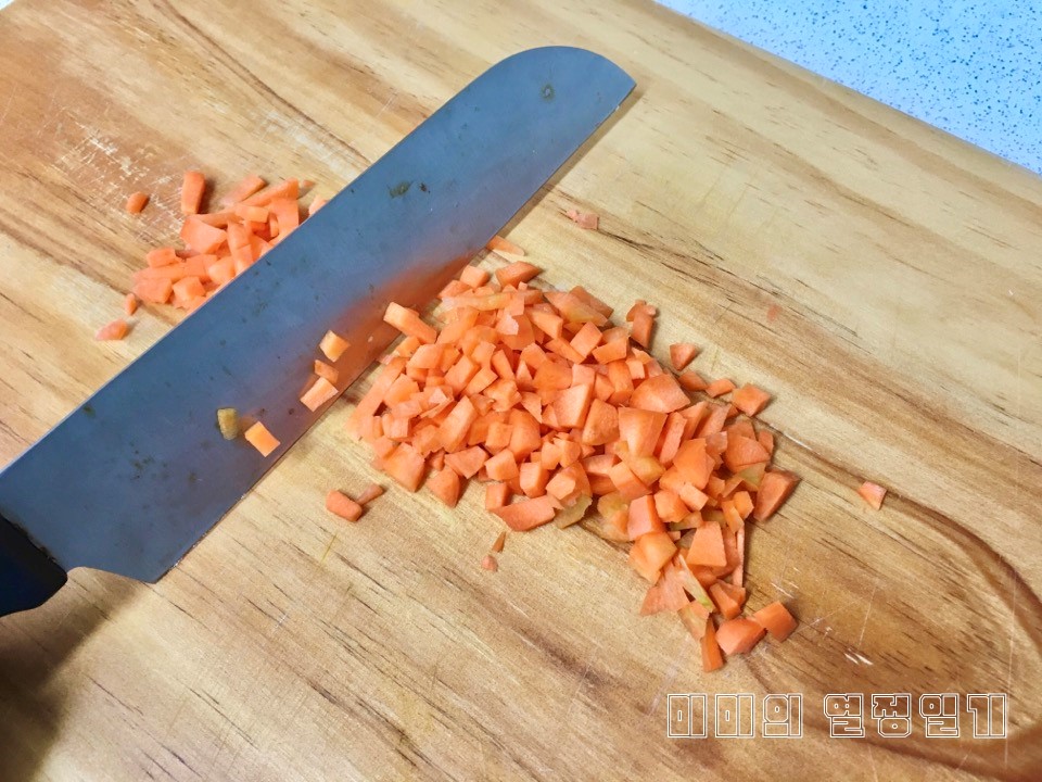 ▲ 당근도 작게 다지듯이 썰어주세요. 볶음밥용 당근은 항상 다지기로 하는 것이 좋습니다.