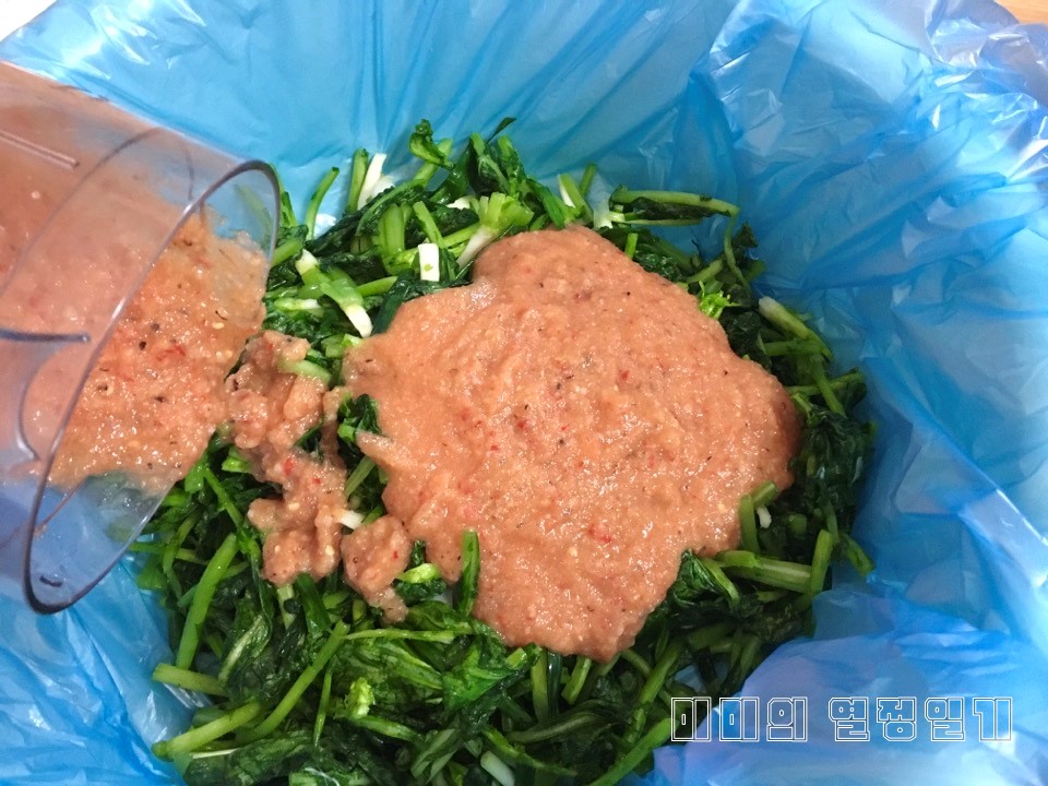 ▲ 소금에 절인 열무, 쪽파에 갈아준 부재료를 넣습니다.