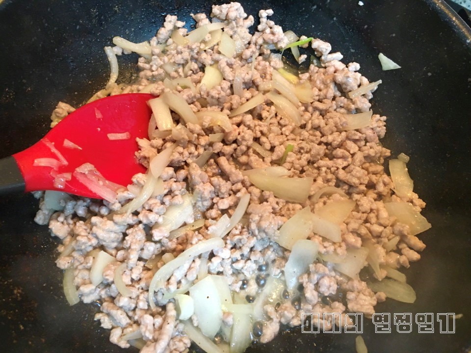 ▲ 양파를 적당히 볶다가, 돼지고기를 넣어주세요.