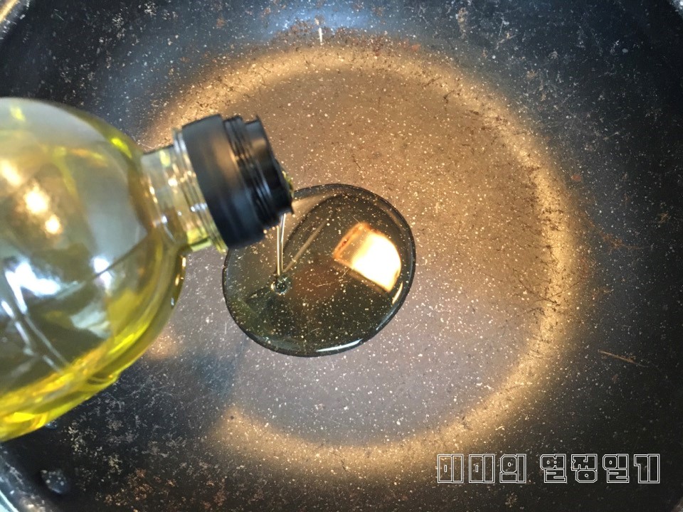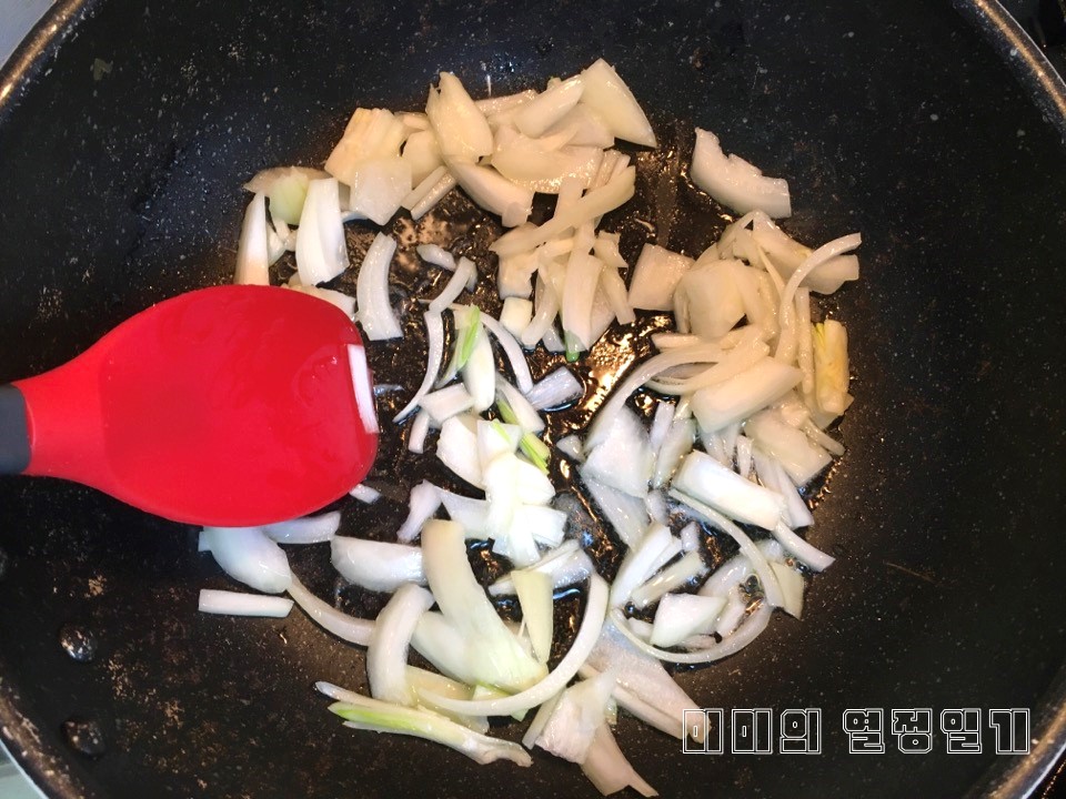 ▲ 식용유 한 바퀴 두르고, 양파를 넣어 볶아줍니다.