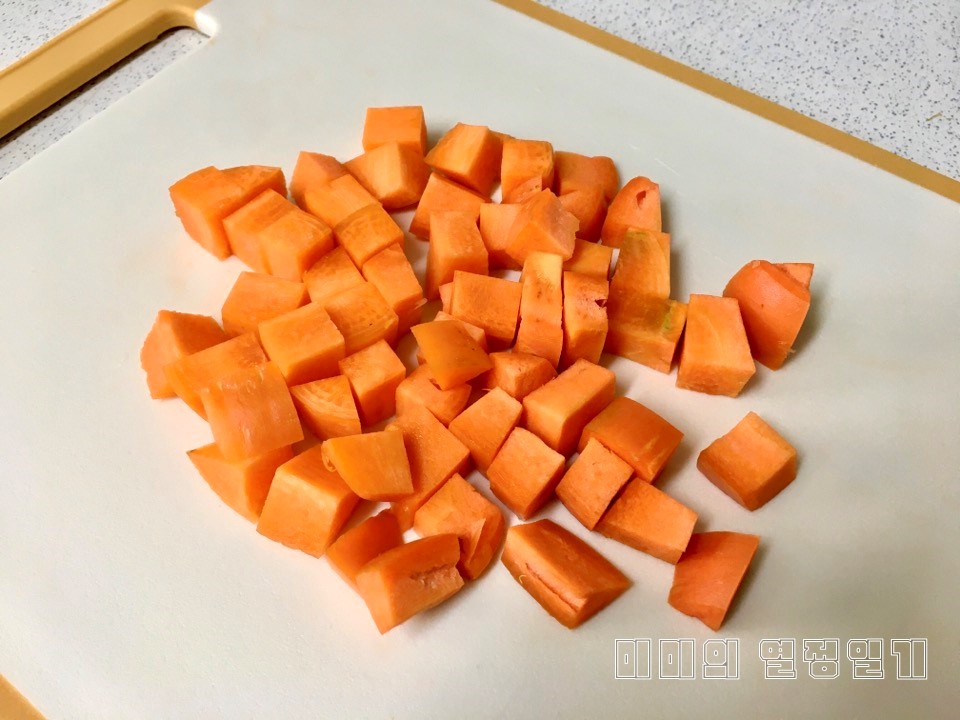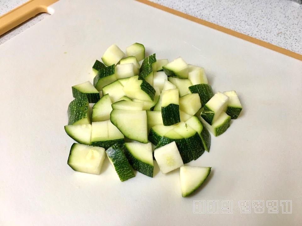어떤 애호박이든 상관없습니다. 여하튼, 애호박도 깍둑썰기로 준비합니다.