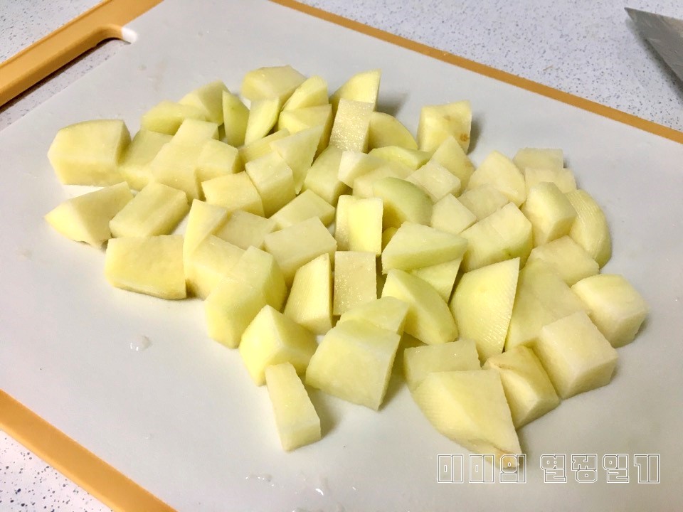 너무 크지 않게 썰어주는 것이 중요합니다. 감자가 너무 크게 익히는 데 시간이 오래 걸려 좋지 않아요.