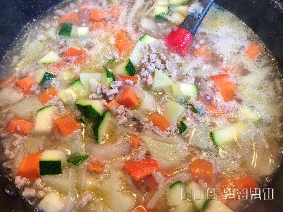 ▲ 애호박을 넣어 주면 좋아요. 저는 냉장고에 남아있는 쥬키니 애호박이 있어서 이걸로 했어요.